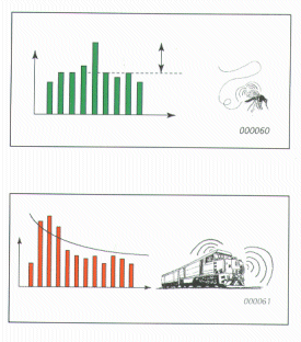 ![]() | Noise is not Just NoiseAt home and at work, we often hear noise from ventilation or heating systems that is hardly noticeable because it has no prominent features. The noise never stops and has no tone, but if the fan suddenly stops or starts to whine, the change may disturb or even annoy us. Our hearing recognises information in the sounds that we hear. Information we don’t need or want is noise. Noise features that make us listen and take notice are tones or changes in sound level. The more prominent the tone, and the more abrupt the change in sound level, the more noticeable the noise.When measuring noise, we need to know the type of noise so that we can choose the parameters to measure, the equipment to use, and the duration of the measurement. Often we need to use our ears to pinpoint the annoying features of the noise, before making measurements, analysing and documenting them. Continuous NoiseContinuous noise is produced by machinery that operates without interruption in the same mode, for example, blowers, pumps and processing equipment. Measuring for just a few minutes with hand-held equipment is sufficient to determine the noise level. If tones or low frequencies are heard, the frequency spectrum can be measured for documentation and further analysis.Intermittent NoiseWhen machinery operates in cycles, or when single vehicles or aeroplanes pass by, the noise level increases and decreases rapidly. For each cycle of a machinery noise source, the noise level can be measured just as for continuous noise. However, the cycle duration must be noted. A single passing vehicle or aircraft is called an event. To measure the noise of an event, the Sound Exposure Level is measured, combining level and duration into a single descriptor. The maximum sound pressure level may also be used. A number of similar events can be measured to establish a reliable average.Impulsive NoiseThe noise from impacts or explosions, e.g., from a pile driver, punch press or gunshot, is called impulsive noise. It is brief and abrupt, and its startling effect causes greater annoyance than would be expected from a simple measurement of sound pressure level. To quantify the impulsiveness of noise, the difference between a quickly responding and a slowly responding parameter can be used (as seen at the base of the graph). The repetition rate (number of impulses per second, minute, hour or day) should also be documented. |