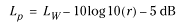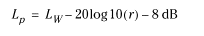 | Point source If the dimensions of a noise source are small compared with the distance to the listener, it is called a point source, for example, fans and chimney stacks. The sound energy spreads out spherically, so that the sound pressure level is the same for all points at the same distance from the source, and decreases by 6 dB per doubling of distance. This holds true until ground and air attenuation noticeably affect the level. For a point source with sound power level, LW(see section on Environmental Noise Parameters and Terminology), located near the ground, the sound pressure level (Lp ) at any distance (r, in m) from that source can be calculated from the equation: