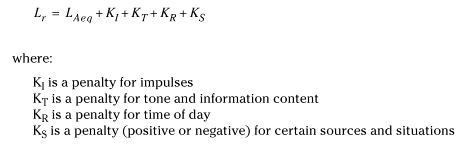 The Rating Level Lr is calculated from LAeq, the equivalent continuous A-weighted sound pressure level, with adjustments (penalties) KT for tonal components and KI for impulsive noise.
