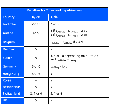 In some countries, a subjective assessment of the characteristics of the noise in question is made. In other countries, an objective test is made to see whether the noise is tonal or impulsive. For example (1) a 1/3-octave frequency band of noise which exceeds the levels in adjacent bands by 5 dB or more for the detection of tonal noise and, (2) a measurement of the difference between and Impulse and A-weighted "Leq" parameter (LAIm,T) and LAeq,T would reveal the presence of impulses. | ![]() |