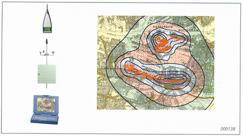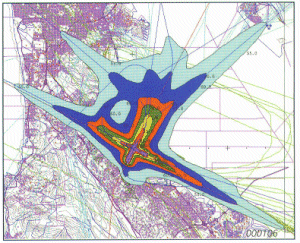 Noise contours are used to show the extent and location of noise problem areas. The number shown with each contour indicates the noise level exceeded within that contour. Superimposed on a map, and compared to noise limits, they pinpoint areas in need of noise reduction measures. Noise footprints show the noise contours for a single aircraft or class of aircraft. Noise footprints can be calculated from noise data for each aircraft and take into consideration flight path, aircraft operation and landscape features. They serve to assess the present and projected noise impact and help plan noise reduction measures. |