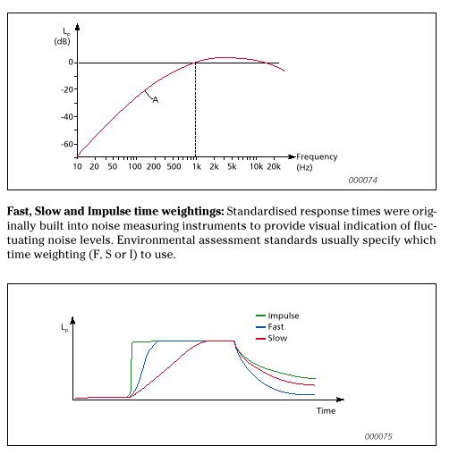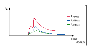 LAFMax, LASMax or LAIMax : Maximum A-weighted noise level measured with Fast (F), Slow (S) or Impulse (I) time weighting. They are the highest level of environmental noise occurring during the measurement time. They are often used in conjunction with another noise parameter (e.g., LAeq) to ensure a single noise event does not exceed a limit. It is essential to specify the time weighting (F, S or I). |