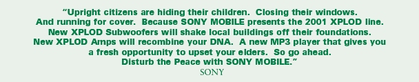 PRESERVE THE PEACE. That's what we do. And we want you to join the effort. Join our Preserve the Peace Campaign. THE PROBLEM: Boom cars are concerts with wheels. Their loud stereo systems can be heard long before the car can be seen. These car stereo systems, capable of being played at deafeningly loud levels, are marketed as sexy and rebellious. An entire set of magazines, including Car Sound and Performance, Car Audio, Car Audio and Electronics, and Auto Sound and Security, has sprung up with the industry. These magazines, like the boom car systems they sell, are aimed at an audience high on hormones, whose system just isnt big enough. ![]() Sex sells, and sex sells car stereos. The ratio of flesh to fabric of the women photographed in the December issue of Car Sound and Performance is greater than 10 to 1. They are selling din by showing skin. Incivility and rebellion also sell car stereos. The enemy is your sleeping neighbor, your parents, anyone over 40, and Peace and Quiet. Just as the tobacco companies before them, the car stereo industry has found a way to coopt and capitalize on rebellion. When multinational corporations incite rebellion, you can be sure it isnt rebellion against injustice or rebellion against war. Nor is it the rebellion of 1776. There is no cause but to disturb the peace. This corporate co-opted rebellion is a rebellion against neighbors. It is a rebellion that doesnt ask for a sacrifice and doesnt hope to make the world better. It has no goal but to be heard and seen. Its value is measured in decibels and corporate profits. The worst corporate offender by far is SONY. SONYs Disturb the Peace ads for amplifiers and speakers that offer ALL NEW WAYS TO OFFEND, are designed to appeal to people who feel they are not receiving the attention they are due. The primary purpose of a 300-watt car stereo amplifier, 10 times more power than the Beatles originally used in concert, is to make you notice them. Boom cars scream into our neighborhoods, I am herelook at meyou cant do anything about it. Their message is all about power. Boom cars are to our streets as bullies were to our schoolyards. They beat you up with decibels instead of fists. They make your chest shake and your ears ache. Boom car owners feel powerful at the expense of their neighbors. ![]() Civility is all about acknowledging others and treating them with respect, as you would like to be treated. The incivility associated with SONYs sales pitch is all about forcing others to acknowledge your presence. This sales pitch isnt coming from a neighborhood thug, but a corporation that is a guest in our country. A very big guest. Fortune Magazine ranked SONY the 69th largest company in the world, and number 6 on the Global Most Admired Companies list. Fortune, of course, doesnt consider corporate responsibility a prerequisite for being admirable. THE SOLUTION: PRESERVE THE PEACE NPC created the Preserve the Peace campaign as an antidote to SONYs Disturb the Peace advertising. The first phase of the campaign, planned for this spring and summer has three components. ![]()