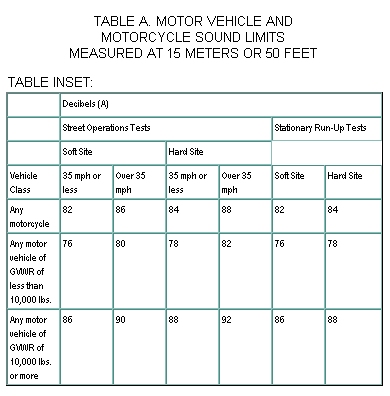 (a) It shall be unlawful for any person to operate or cause to be operated a motor vehicle or motorcycle at any time which creates a noise which exceeds the sound level set forth in table A.