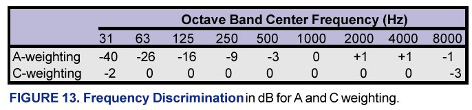 A simple sound level meter combines sound pressure levels over all frequencies to give the overall SPL in dB. More complex meters have filters that can measure the SPL in each octave band or one-third octave band separately so we can identify the level in each band, thus identifying the spectrum of the sound. Sound level meters can also “weight” the sound pressure level by adjusting the level in different frequencies before combining the levels into a weighted overall level. For example, A-weighting reduces the level of sounds at low frequencies to simulate the variations in sensitivity of the ear to different frequencies. A-weighted values are denoted as dBA to differentiate them from unweighted dB levels. Similarly, C-weighted values are labeled dBC. C-weighting slightly reduces the level of sounds below 50 and above 5000 Hz, but is nearly flat in between, and can be used to approximate an unweighted reading on sound level meters that only offer A- or C-weighting. Comparing A- and C-weighted levels for a noise source can provide a rough estimate of its frequency distribution. If the two levels are within 1 or 2 dB, most of the noise is above 500 Hz. If the two levels vary by more than a few dB, a significant amount of the noise is in the lower frequencies. To convert unweighted octave band sound pressure levels into weighted A or C levels, add or subtract the amounts noted in Figure 13 from the corresponding frequency bands. Next, sum the octave band levels (two at a time as explained below) to arrive at the overall dBA or dBC value.