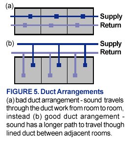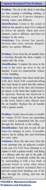 Finding the source of mechanical noise in a room is sometimes as difficult as finding the proverbial needle in a haystack. The noise can originate from one or many sources, and complex cases are best handled by a professional acoustical consultant with the skills and equipment to locate and reduce the levels of all noise sources. Bearing that in mind, Figure 4 lists a few common problems you can look for in an existing classroom with excess mechanical noise resulting from a central mechanical system that distributes air to the rooms through ductwork.