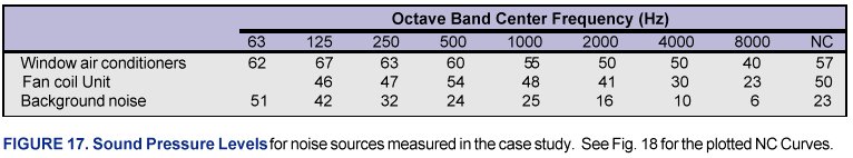 The noise level in a space can be effectively described with a single-number rating called the noise criteria (NC) rating. The NC rating is determined by measuring the sound pressure level of the noise in each octave band, plotting these levels on a graph, and then comparing the results to established NC curves. The lowest NC curve not exceeded by the plotted noise spectrum is the NC rating of the sound. On most graphs, NC curves are shown in intervals of 5 to save space, but the NC rating can be given as any whole number in between, not just as a multiple of 5. To illustrate this, we will find the NC rating for the window air conditioners, unit ventilator, and background noise from the case study presented above. (See Figures 17 and 18.) A blank NC chart has been provided. (See Figure 19.)