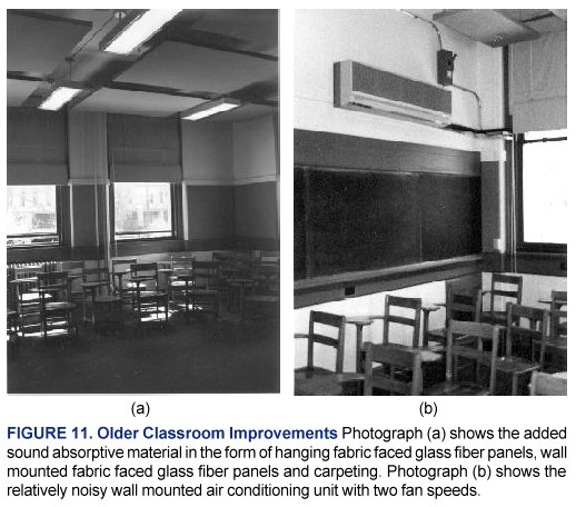 The topic of this case study is a classroom in an older university building that was the subject of complaints from teachers about the generally poor acoustical conditions including high noise levels and poor speech intelligibility. While this is a university classroom, its design is typical of many classrooms in older elementary and secondary schools. The room, shown in Figure 11, has high plaster ceilings and many tall windows. The building was originally constructed with no central air conditioning system, so several window air conditioners were added, which were very noisy. In order to properly prepare recommendations for improving the acoustical conditions of this room, the ambient noise levels as established by the window air conditioning units were measured and the reverberation times of the room were also measured. It was important that acoustical conditions be improved without adveresly affecting room aesthetics.