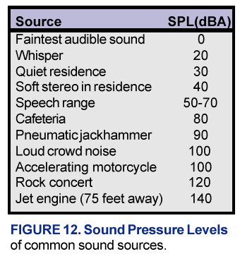 The most common measure of a sound’s level is Sound Pressure Level, or SPL, expressed in decibels, abbreviated dB. Decibels are not typical units like inches or pounds in that they do not linearly relate to a specific quantity. Instead, decibels are based on the logarithmic ratio of the sound power or intensity to a reference power or intensity. Sound power and intensity are not easy to measure. However, sound pressure is easily measured with a sound level meter. Sound pressure may also be expressed in dB since sound pressure squared is proportional to sound power or intensity. We use dB instead of the actual amplitude of the sound in units of pressure because its logarithmic value represents the way our ears interpret sound and because the numbers are more manageable for our calculations. Most sounds fall in the range of 0 to140 dB, which is equivalent to waves with pressures of 20 to 200,000,000 micropascals (or 2 x 10 -10 to 2 x 10 -2 atm). To help you get a feeling for sound pressure levels (in dB), the approximate SPLs of some common sound sources are given in Figure 12.