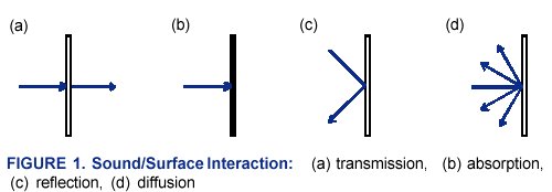 Think of sound as a beam, like a ray of light, passing through space and encountering objects. When sound strikes a surface, a number of things can happen, including: Transmission-- The sound passes through the surface into the space beyond it, like light passing through a window. Absorption-- The surface absorbs the sound like a sponge absorbs water. Reflection-- The sound strikes the surface and changes direction like a ball bouncing off a wall. Diffusion-- The sound strikes the surface and is scattered in many directions, like pins being hit by a bowling ball. (See Figure 1.) Keep in mind that several of these actions can occur simultaneously. For instance, a sound wave can, at the same time, be both reflected by and partially absorbed by a wall.