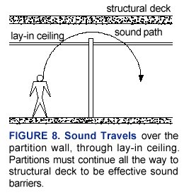 To be effective, partition walls should extend from the structural floor to the structural ceiling. Otherwise, sound from one room can easily pass through a lay-in acoustical tile ceiling, over the partition wall, and down through the lay-in ceiling of the next room. (See Figure 8.) This is commonly overlooked when walls are added during renovations, such as when open-plan classrooms are partitioned.