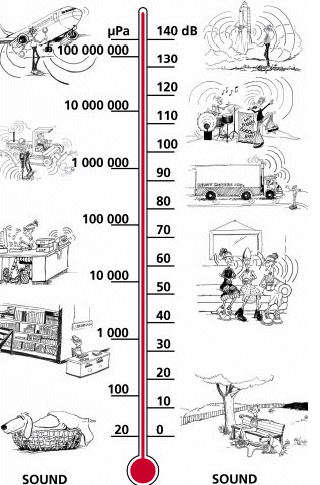 20 µPa corresponds to the average person’s threshold of hearing. It is therefore called the threshold of hearing. A sound pressure of approximately 100 Pa is so loud that it causes pain and is therefore called the threshold of pain. The ratio between these two extremes is more than a million to one.