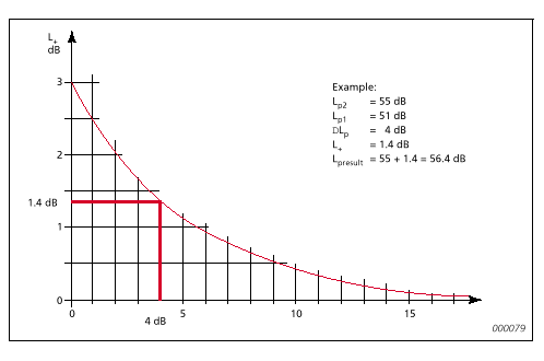 Note that a change in L = 0 corresponds to the situation shown in the previous illustration where 3 dB was added to the level caused by one source alone. If the difference between the two sound pressure levels is more than 10 dB the contribution from the quietest source can be discarded.