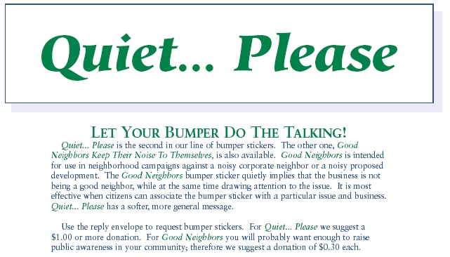 Welcome to the second issue of The Quiet Zone. In our premier issue, we tried to define the noise problem with our feature article, 20 Noises We Can Do Without. Future editions of the Noise Pollution Clearinghouses newsletter will focus on solving noise problems. In this issue we take on Boom Cars and Airports, and we are asking you to help. The lead article features our Preserve the Peace project, NPCs antidote to Sony Corporations Disturb the Peace marketing campaign for its car audio systems. We invite you to join the effort by sending Howard Stringer, the CEO of Sony America, a letter asking him to become a better corporate neighbor, stop marketing incivility, and donate the trademark Disturb the Peace to the Noise Pollution Clearinghouse for safe keeping. In addition, NPC is releasing two new tools for citizens and citizen groups facing aviation noise. The first is a study of the top concerns of those living near airports. The second is a new website, that helps track what the FAA and federal government are doing at each of the 100 most likely to expand airports. We are also commencing a study of airport noise effects and hope youll participate. Peace and Quiet, Les Blomberg, Executive Director |