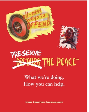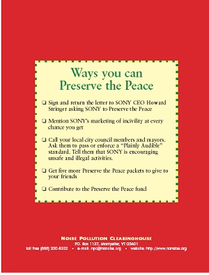 PRESERVE THE PEACE. That's what we do. And we want you to join the effort. Join our Preserve the Peace Campaign. THE PROBLEM: Boom cars are concerts with wheels. Their loud stereo systems can be heard long before the car can be seen. These car stereo systems, capable of being played at deafeningly loud levels, are marketed as sexy and rebellious. An entire set of magazines, including Car Sound and Performance, Car Audio, Car Audio and Electronics, and Auto Sound and Security, has sprung up with the industry. These magazines, like the boom car systems they sell, are aimed at an audience high on hormones, whose system just isnt big enough. ![]() Sex sells, and sex sells car stereos. The ratio of flesh to fabric of the women photographed in the December issue of Car Sound and Performance is greater than 10 to 1. They are selling din by showing skin. Incivility and rebellion also sell car stereos. The enemy is your sleeping neighbor, your parents, anyone over 40, and Peace and Quiet. Just as the tobacco companies before them, the car stereo industry has found a way to coopt and capitalize on rebellion. When multinational corporations incite rebellion, you can be sure it isnt rebellion against injustice or rebellion against war. Nor is it the rebellion of 1776. There is no cause but to disturb the peace. This corporate co-opted rebellion is a rebellion against neighbors. It is a rebellion that doesnt ask for a sacrifice and doesnt hope to make the world better. It has no goal but to be heard and seen. Its value is measured in decibels and corporate profits. The worst corporate offender by far is SONY. SONYs Disturb the Peace ads for amplifiers and speakers that offer ALL NEW WAYS TO OFFEND, are designed to appeal to people who feel they are not receiving the attention they are due. The primary purpose of a 300-watt car stereo amplifier, 10 times more power than the Beatles originally used in concert, is to make you notice them. Boom cars scream into our neighborhoods, I am herelook at meyou cant do anything about it. Their message is all about power. Boom cars are to our streets as bullies were to our schoolyards. They beat you up with decibels instead of fists. They make your chest shake and your ears ache. Boom car owners feel powerful at the expense of their neighbors. ![]() Civility is all about acknowledging others and treating them with respect, as you would like to be treated. The incivility associated with SONYs sales pitch is all about forcing others to acknowledge your presence. This sales pitch isnt coming from a neighborhood thug, but a corporation that is a guest in our country. A very big guest. Fortune Magazine ranked SONY the 69th largest company in the world, and number 6 on the Global Most Admired Companies list. Fortune, of course, doesnt consider corporate responsibility a prerequisite for being admirable. THE SOLUTION: PRESERVE THE PEACE NPC created the Preserve the Peace campaign as an antidote to SONYs Disturb the Peace advertising. The first phase of the campaign, planned for this spring and summer has three components. ![]()