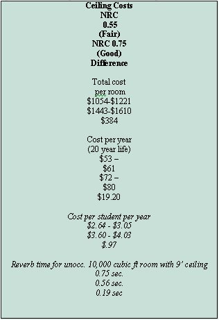 Some classrooms suffer from excessive reverberation due to insuffi-ient sound absorption. If the ceilings are not too high, a cost-effective way of introducing sound absorption is with an acoustical ceiling. Table 1 shows that the cost difference between a mediocre acoustical ceiling of NRC (Noise Reduction Coefficient) 0.55 and a good ceiling with NRC 0.75 is less than $1 USD per student, when amortized over a 20 year lifetime. It also shows that unoccupied classroom T60 for the mediocre ceiling is 0.75 sec., somewhat too high for a learning space. The better ceiling reduces T60 by almost 0.2 sec, which can make a noticeable improvement.